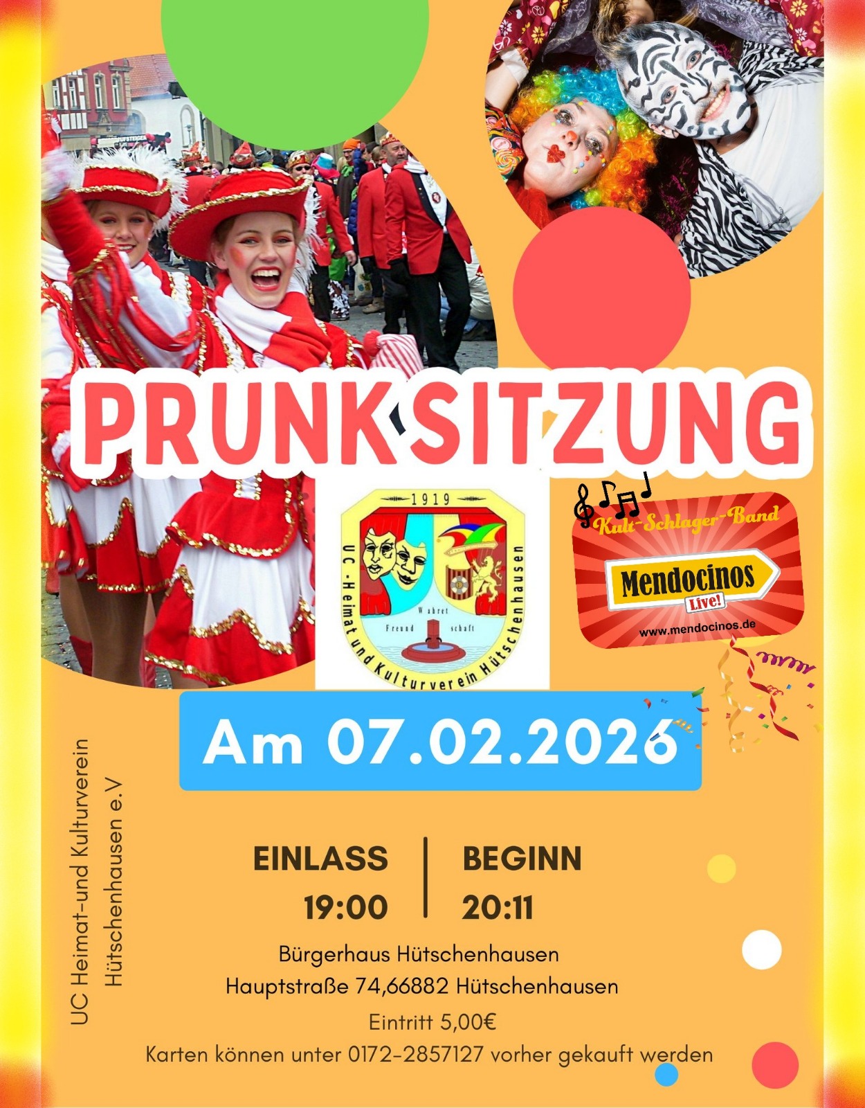 Der UC Heimat und Kulturverein e.V veranstaltet am Samstag 07.02.2026 wieder seine bunte Prunksitzung. Ab 19:00Uhr öffnet das Bürgerhaus Hütschenhausen seine Türen. Die Narrenscharr wird um 20:11Uhr die Bühne betreten. Eintritt 5€. Es freuen sich viele Akteure aus nah und fern.
