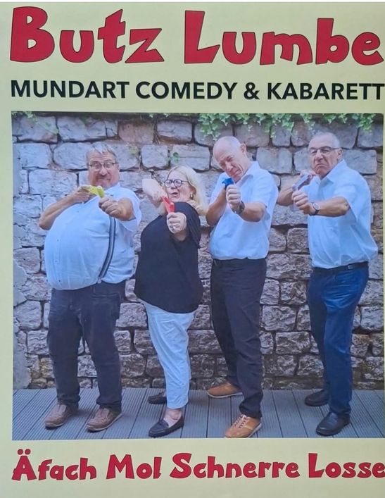 Wir begrüßen das Frühjahr 2026 mit der in Katzenbach schon sehr bekannten Pfälzer Mundartgruppe „Die Butz Lumbe“, ein Kabarett- und Comedy Quartett, das mit seinem neuen Programm „Äfach mol schnerre losse“ wieder für beste Unterhaltung sorgt. Freuen Sie sich auf witzige Sketche, charmante Pantomime und pointierte Alltagsgeschichten, die mit viel Lokalkolorit und pfälzischem Humor das Publikum begeistert. Ein Abend voller Lacher, Lebensfreude und liebevoller Beobachtungen – Pfälzer Mundart in ihrer unterhaltsamsten Form!