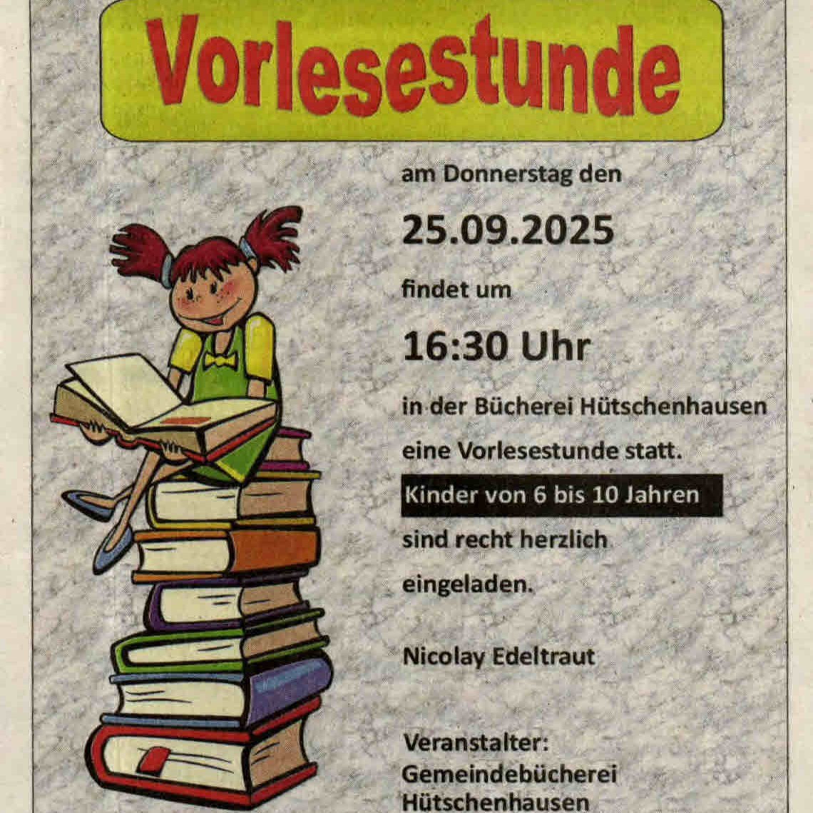 Vorlesestunde in der Gemeindebücherei Hütschenhausen Am Donnerstag, 25. September 2025, findet um 16:00 Uhr in der Bücherei Hütschenhausen eine Vorlesestunde statt. Eingeladen sind Kinder im …